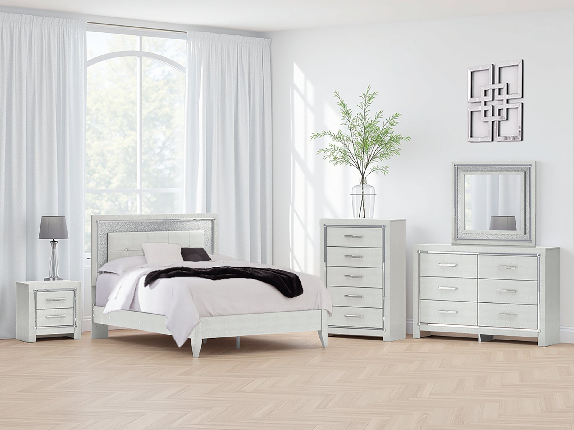 Bright, bold luxury. This queen upholstered bed dazzles with its attention to detail. Your love of glamorous style is reflected in the tufted upholstery with faux alligator effect, exquisitely paired with faceted chrome-tone and glittery details. Complete with LED lighting around the headboard, it inspires you to live luxuriously every day—from waking up to reading before bed.